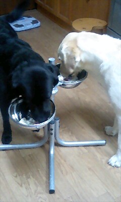 ココちゃん、ナナちゃんのお食事の様子ですが、2頭のわんちゃんとも、楽な姿勢でお食事をしている様子です。