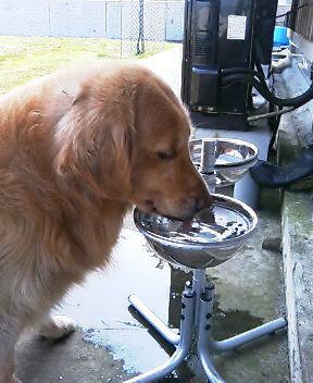 ゴールデンのオースティン君です。 お水を飲んでいるところをなるべく低い位置から写真を取っていただきました。お水を飲む際に、食器を地面に置いた場合のことを考えれば、やはり、わんちゃんの前脚に負担がかかりません。